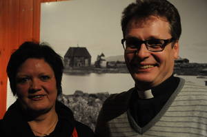 Framför ett foto av Arjeplogs tidigare kyrka på Silvermuseet, prästerna Niklas Westling och Ingrid Holmström Pavval som håller i trådarna bakom kulisserna på filmfestivalen. Hör Ingrid berätta om hur idén till filmfestivalen i Arjeplog kom till för åtta år sedan.