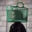 Eller reduktionen av människa till ting i konsumtionssamhället som hon gestaltar genom att gå omkring med en varukorg runt huvudet på en grönsaksmarknad.