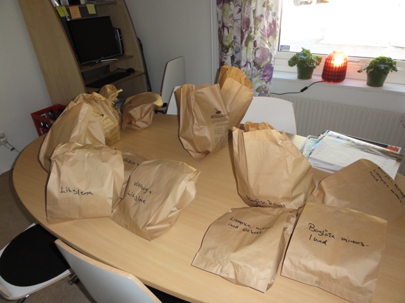 Denna lite kyliga oktobermorgon möts kyrkogårdsförvaltningens arbetslag av ett bord uppdukat med godispåsar. Nä, det är inget ätbart godis, det är ögongodis som alla kyrkogårdsbesökare kommer att få njuta av till våren.
