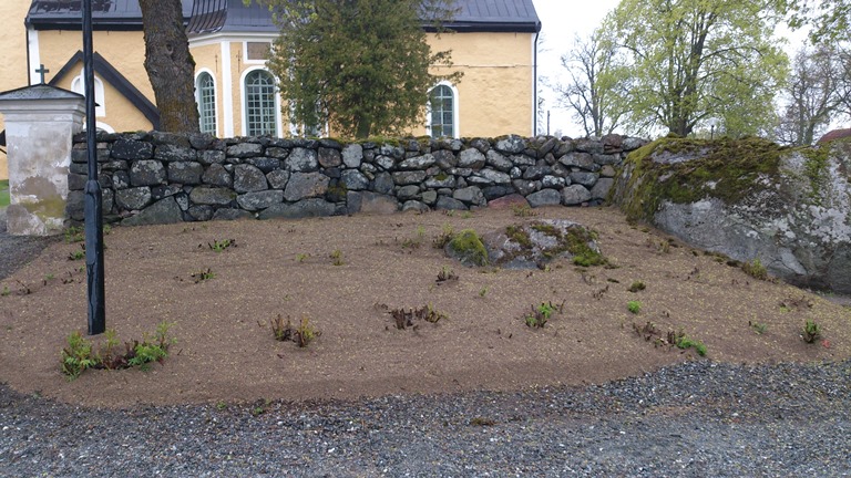 Vid Enköpings-Näs kyrka har kyrkogårdsförvaltningen rensat och beskurit nyponrosor. Nu väntar vi med spänning på att rosbuskarna ska växa till sig och blomma vackert.