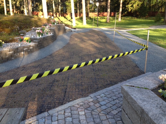 I minneslunden på S:t Olofs kyrkogård har gräsmattan runt smyckningsytan blivit förstärkt. Förhoppningen är att den ska tåla trampet av många fötter, även om hösten blir blöt.