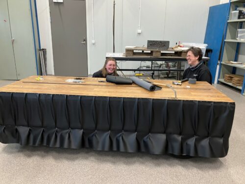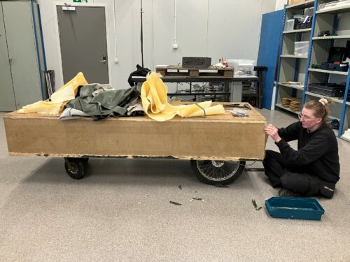 Ett stort och pilligt arbete som utförs just nu och som snart är färdigt är ”kjolbyte” på vår katafalk. Det är en draperad vagn där kistan placeras vid begravning. Under vinterhalvåret har vi också möjlighet att ha demo på olika maskiner.