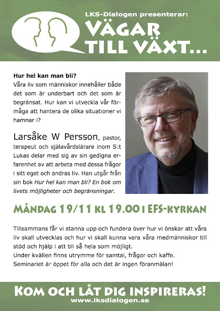 Jag skrev för ett tag sedan om Larsåke W Perssons bok ”hur hel kan man bli”. Nu har du som finns i trakten av Lidköping chansen att höra honom tala om det själv. Den 19e november klockan 19 i EFS-kyrkan i Lidköping (intill den stora Nicolaikyrkan) kan man höra och se honom live.