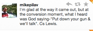 C.S Lewis är visst oundviklig i citatsammanhang. Den kristne är inte någon som kommit fram till en ståndpunkt, utan ännu mer en rebell som lagt ner sina vapen och slutit fred med Gud.