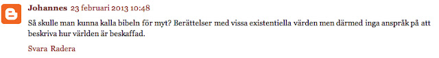 Jag har skrivit tidigare att även om vi till vardags använder ordet myt i betydelsen ”något som inte stämmer” så använder man det annorlunda i vetenskapliga sammanhang. En myt är en historia som säger något på djupet om våra mänskliga levnadsvillkor och vad det är att vara människa. Därför skulle man kunna säga att även om myten har en osannolik handling eller är konstig på många sätt så är det ändå sann på ett djupare plan. Svaret på frågan är nog både ja och nej. Bibeln innehåller många myter men den gör just därför samtidigt anspråk på att beskriva hur världen är beskaffad, om än på ett annat sätt.