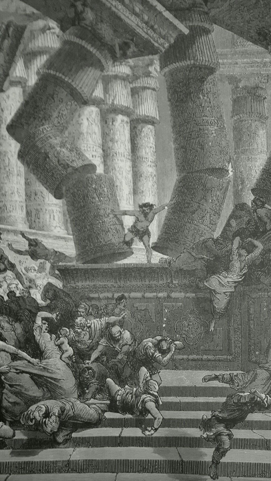Likt Jesus ber Simson till Gud före sin död. Då Jesus ber Gud att förlåta dem som gör honom ont ber Simson istället om att få hämnas det de gjort mot honom. Simson ställer sig mellan två pelare med armarna rakt ut mot båda och får sedan för en stund tillbaka sina krafter så att han kan vräka omkull pelarna så att hela huset rasar ner. Det står sedan att: