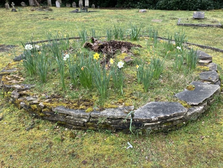 Restaureringen av kyrkogården är nu slutförd och församlingen har just planterat nya blommor i den numera vackra rundeln som fyllts med jord.